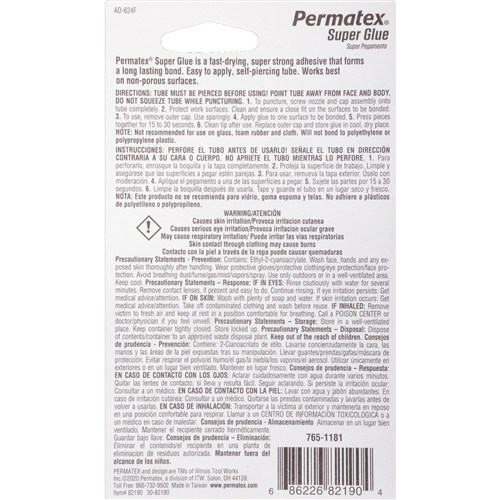 This formulation was specially designed for a faster, long-lasting bond. It is easily applied and works on nonporous materials including metal, plastics, rubber, vinyl, paper, wood, and textiles. Permanent, transparent bond fills gaps to .004.