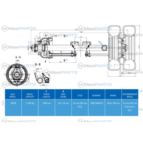 MAXUS Axle Assemly. 10 stud 285 PCD. Iron preset hubs cast drums with a parrael spindle, 73 inch track and 6 inch tube.