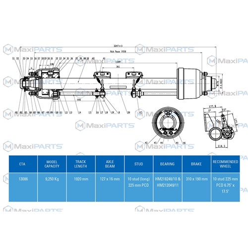 MAXUS Axle Assemly. 10 stud 225 PCD. 12.75x7 brake long stud, ABS ready with inboard drums. 77 inch track and 6 inch tube.