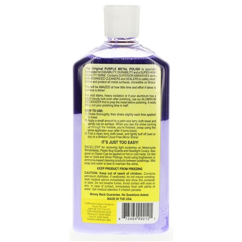 Purple Metal Polish is in a class of it's own. This is truly a no-rub metal polish. When you see just how easy it actually is to polish aluminum, you will be totally amazed. Specially formulated for easabilty, durability and a super high quality shine. It is a super quick and easy maintenance product. Purple Metal Polish contains a superior abrasive along with Hi-tech cleaners and sealers to safely clean, shine and protect all metal surfaces without scratching!