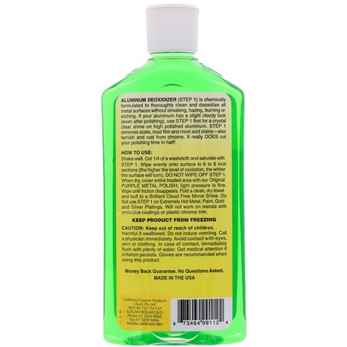 After saturating a palm size terry cloth towel with Aluminium Deoxidizer (Step-1), you simply wipe on surface. Then apply our Purple Metal Polish over the entire treated area and buff off to an incredible shine!