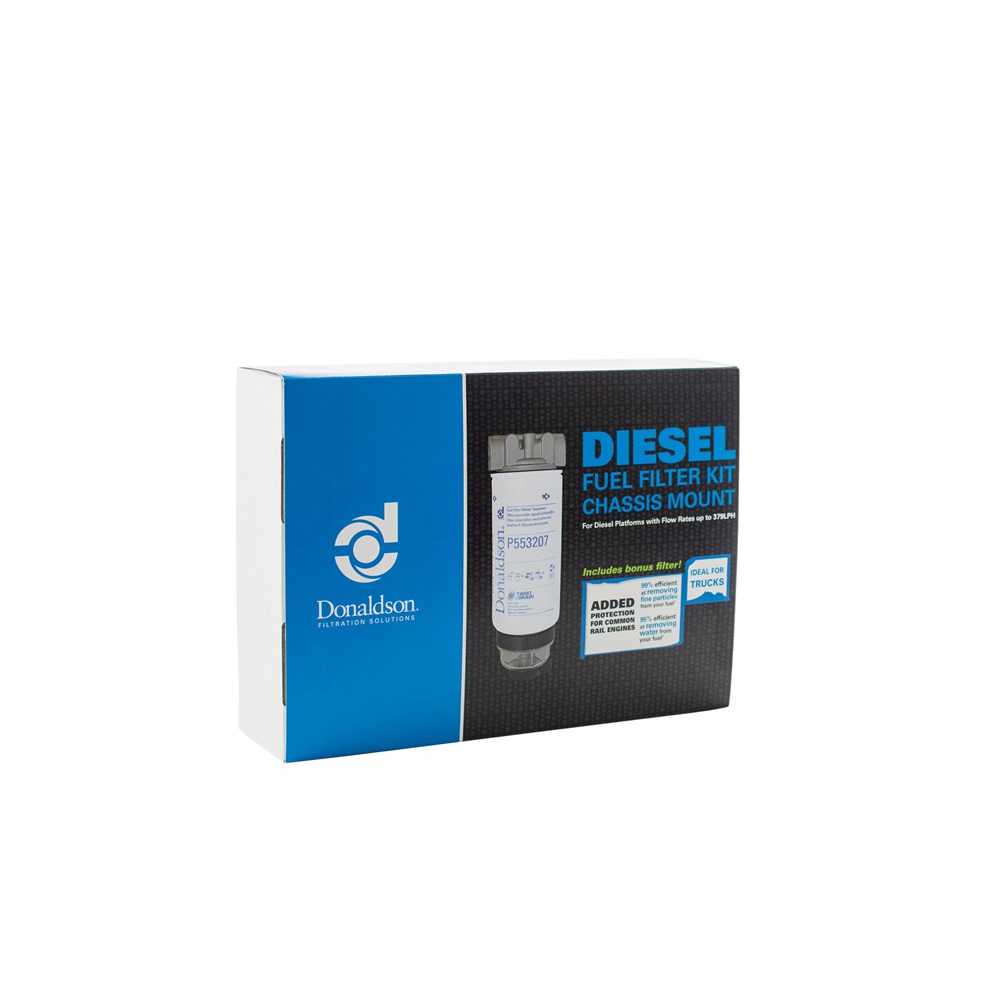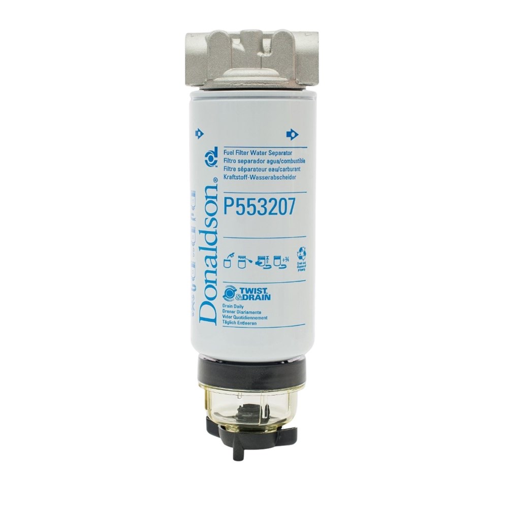 Kit contains 1x Head Assembly, Fuel (P562261), 2x Fuel Filter, Water Separator Spin-On Twist&Drain (P553207) and 1x Bowl, Twist&Drain (P569758).