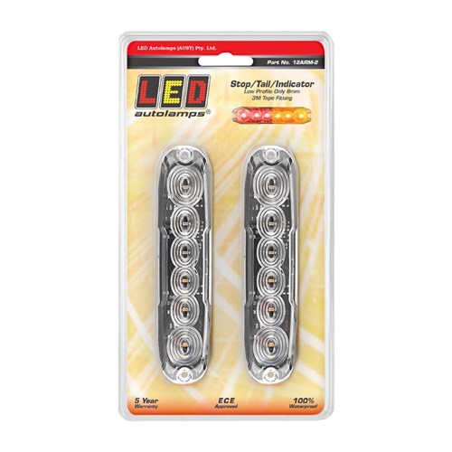 Stop/Tail/Indicator Lamp, Clear Lens Colured LEDs, 12-24V Multivolt, ECE Approved, 3M Tape, Screw Surface Mounting, 131mm x 30mm x 8mm, Blister Pack of 2, 5 Year Warranty
