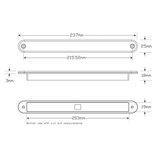 Indicator Strip Lamp in 12volt with 10 square LEDs. Recessed mount with 40cm hardwired. Size: 237 x 25 x 18mm. ADR Approved CRN 39092