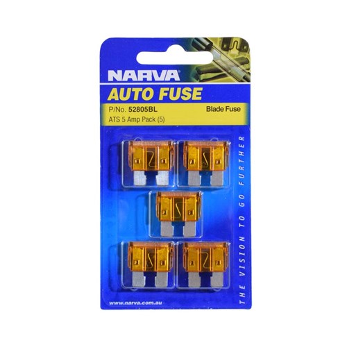 5 pack of NARVA 5 Amp, Orange, Standard ATS Blade Fuse.