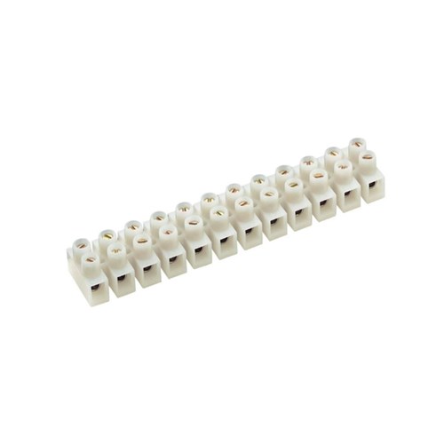 Strip of 12 terminal blocks, manufactured of polyamide (nylon), with a maximum operating temperature of 105 C (Degrees Celsius).