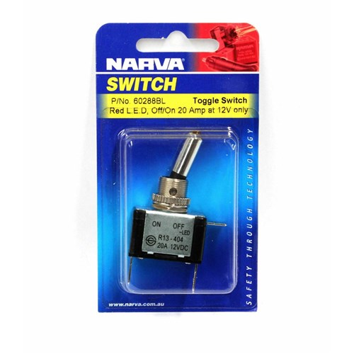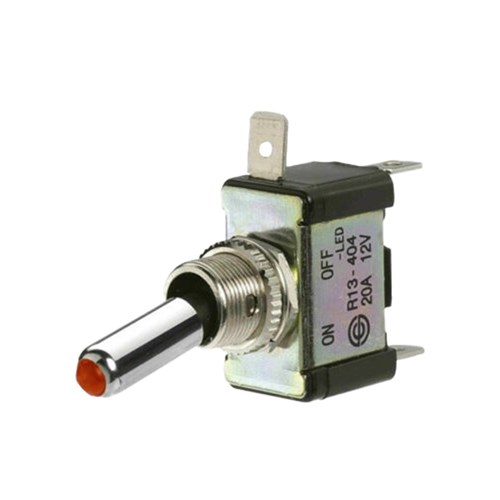 SPST, push on terminals Amperage rating 20A for use at 12V only Mounting opening 12mm dia.