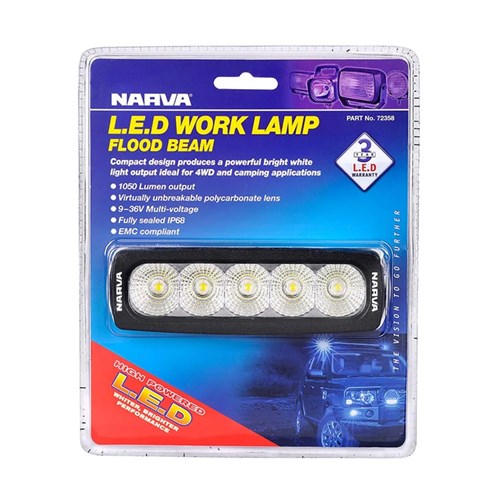 Narva's 4x4 work lamps are compact, rugged and versatile, punching out powerful bright white light for adventurers. Part no: 72358 produces a wide spread of usable light for general lighting. L.E.Ds come backed by Narva's 3 year L.E.D warranty for peace of mind.