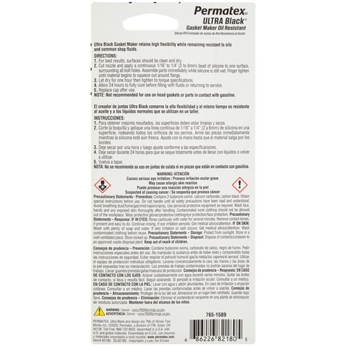 For dealership warranty requirements, Ultra Black ensures extended drivetrain warranty compliance. Fast-curing formula. Sensor-safe, low odor, noncorrosive. Meets performance specs of OE silicone gaskets. Retains high flexibility, oil resistant properties through use of a patented adhesion system. Temperature range -54°C to 260°C intermittent, resists auto and shop fluids and vibration. OEM specified.